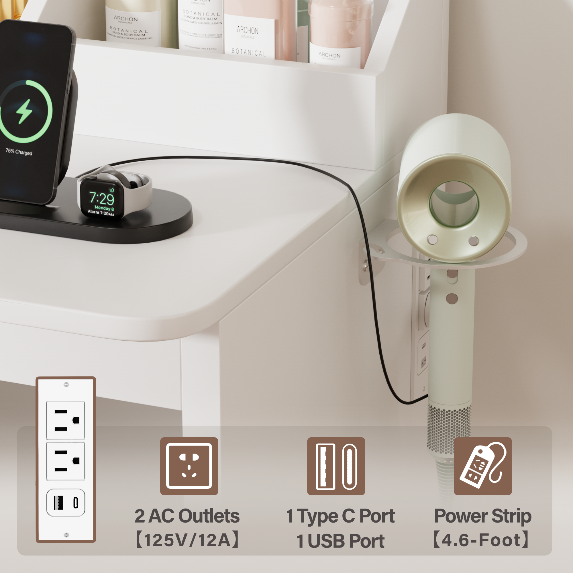 LED Lighted Mirror& Built-In Power Outlet: Clear mirror with adjustable brightness can perfectly satisfy your need of different scenes like doing your makeups or taking photos. With built-in outlet strip and a hair dryer rack, this vanity desk makes your beauty more convenient