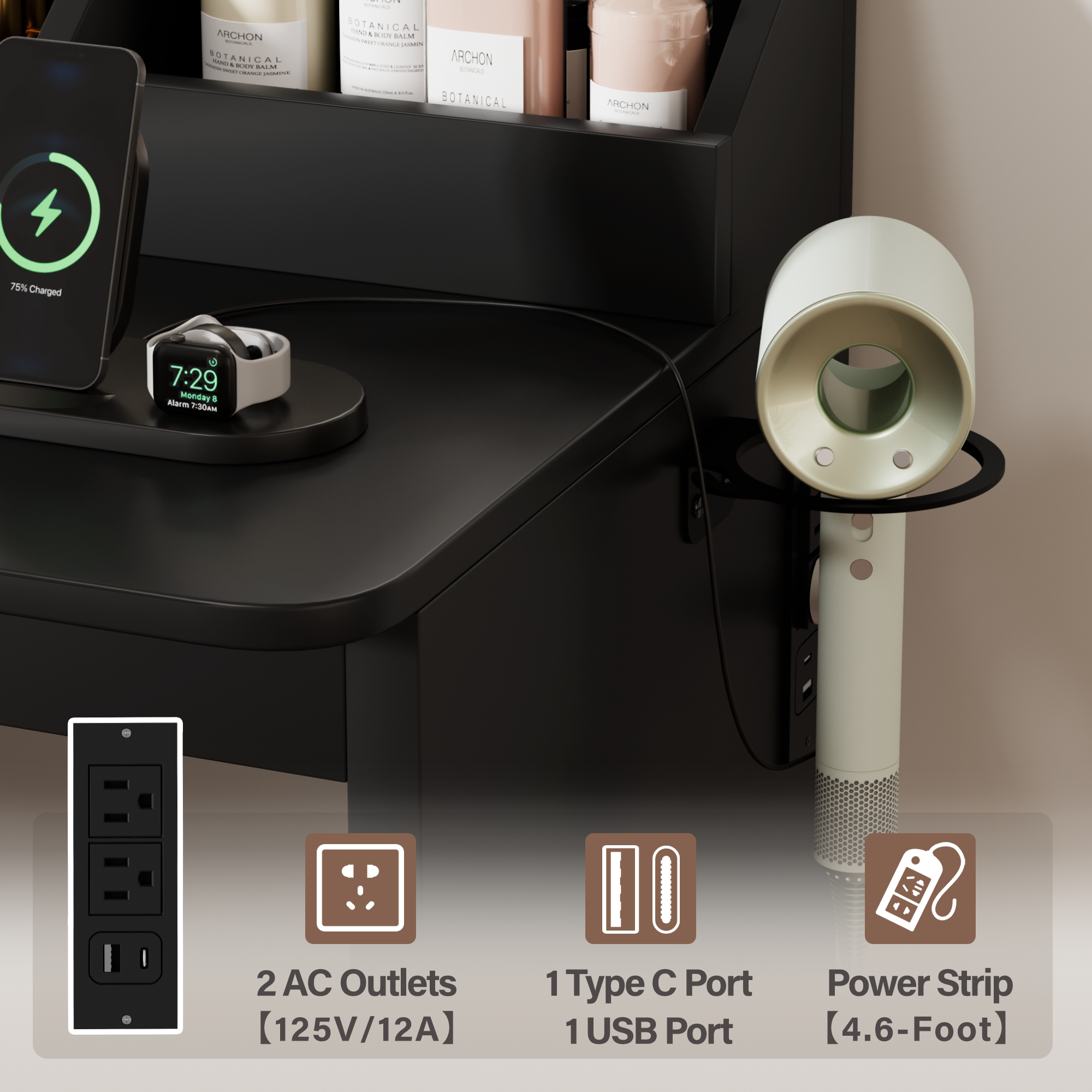 LED Lighted Mirror& Built-In Power Outlet: Clear mirror with adjustable brightness can perfectly satisfy your need of different scenes like doing your makeups or taking photos. With built-in outlet strip and a hair dryer rack, this vanity desk makes your beauty more convenient