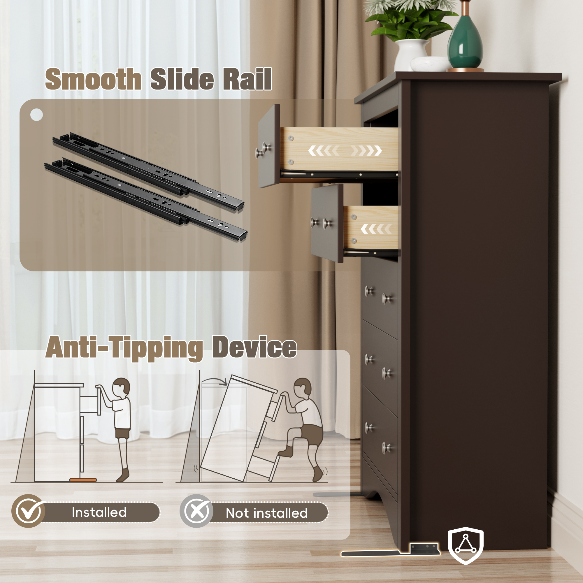 Smooth sliding drawers: Equipped with reinforced slides, the drawers glide smoothly without sticking, ensuring durability. Even when fully loaded, the drawers open and close effortlessly, enhancing daily usability.