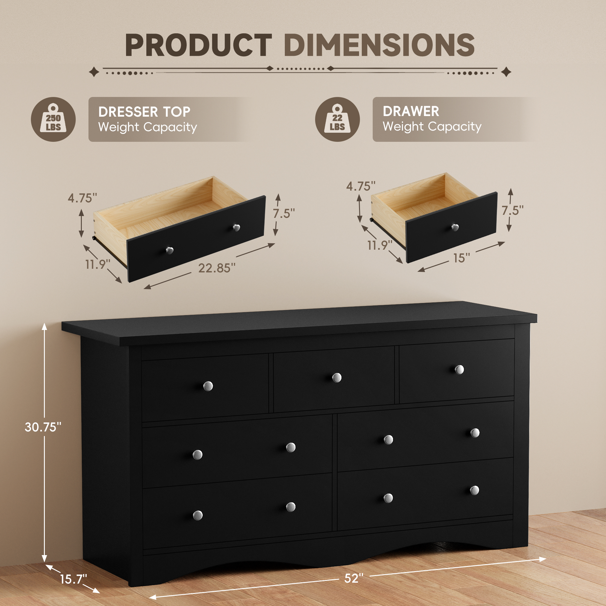 Furmax Dresser for Bedroom, 7 Wood Dresser, Chest of Drawers, for TV up to 65 inch, TV Stand Storage Chest of Drawers for Hallway Entryway (Black)